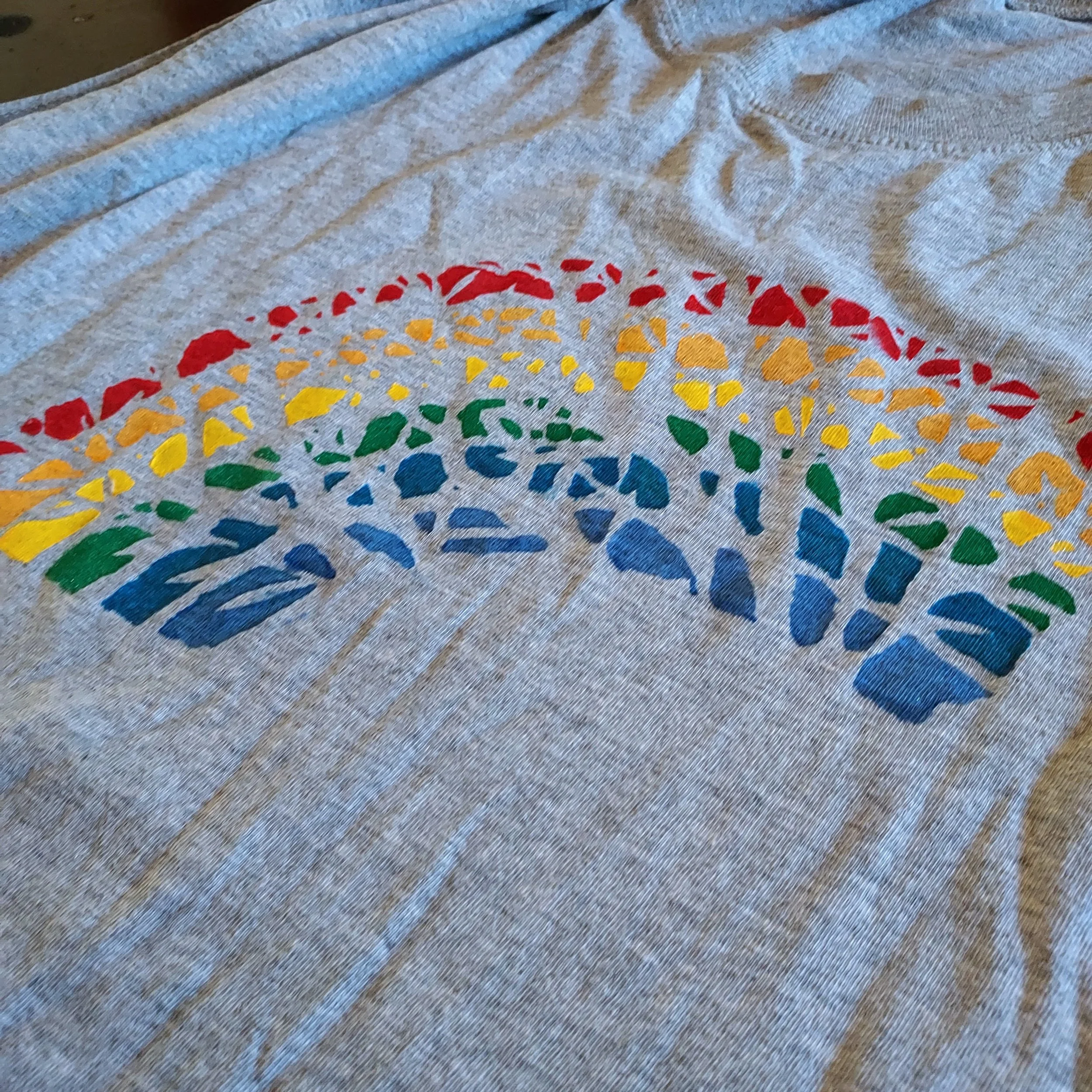one-of-a-kind, upcycled top, with hand-drawn, hand-cut, stenciled rainbow tree-of-life design. blank tops sourced from Savvy Hive in North Adams, MA.